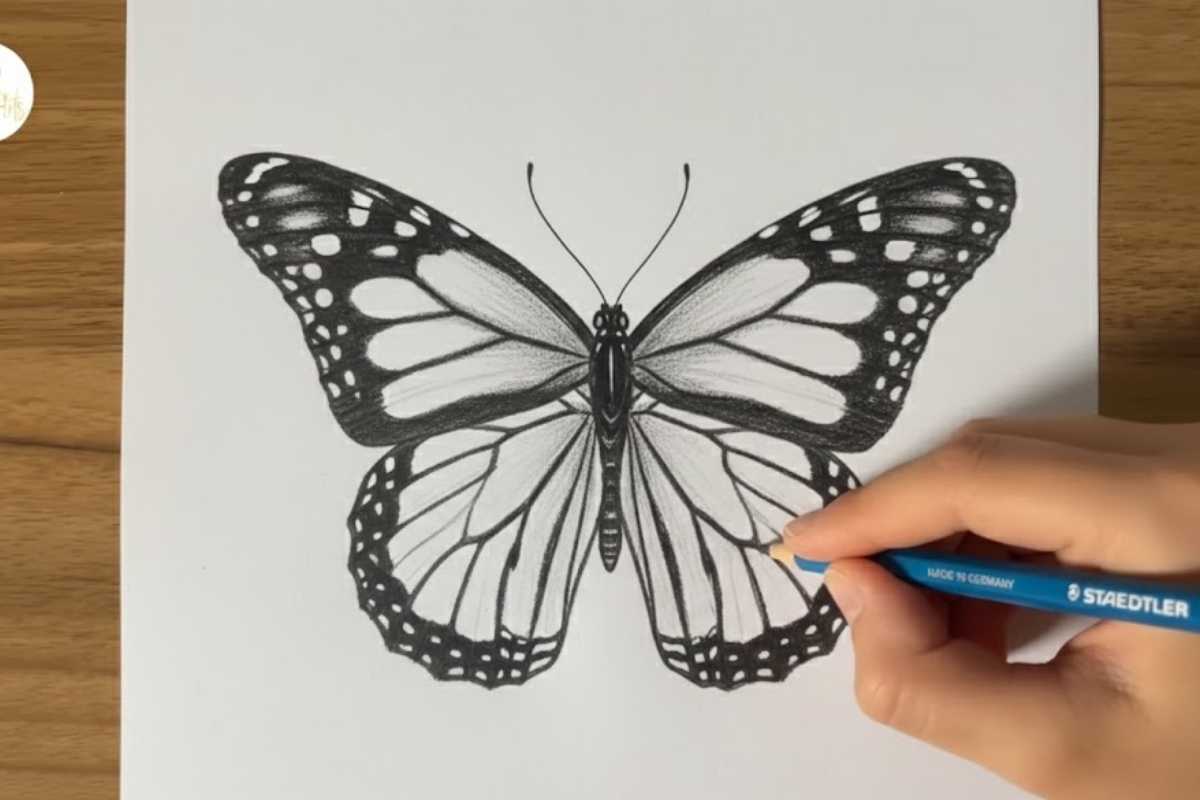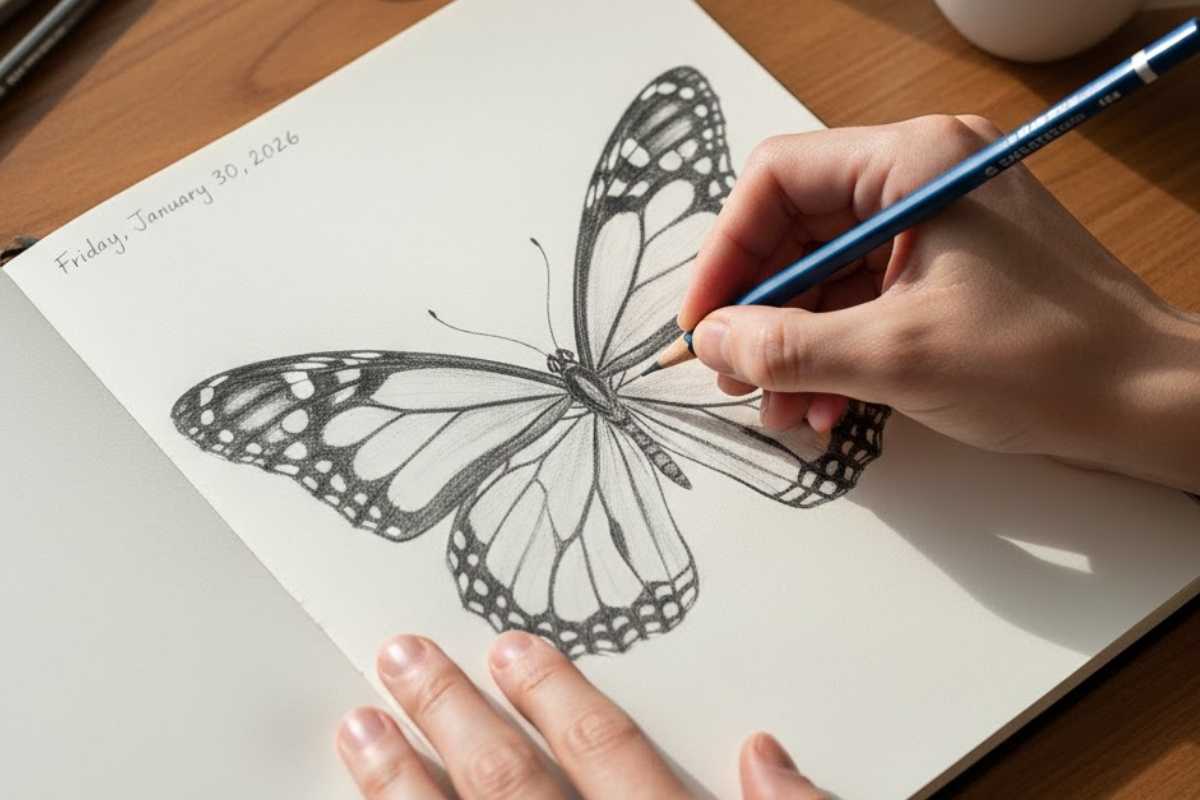 Practice tip: ghost your lines before committing; then use a sharp HB for structure and a softer pencil for the final contour. It’s a gentle ramp for anyone exploring butterfly drawing easy projects after a long break from sketching.