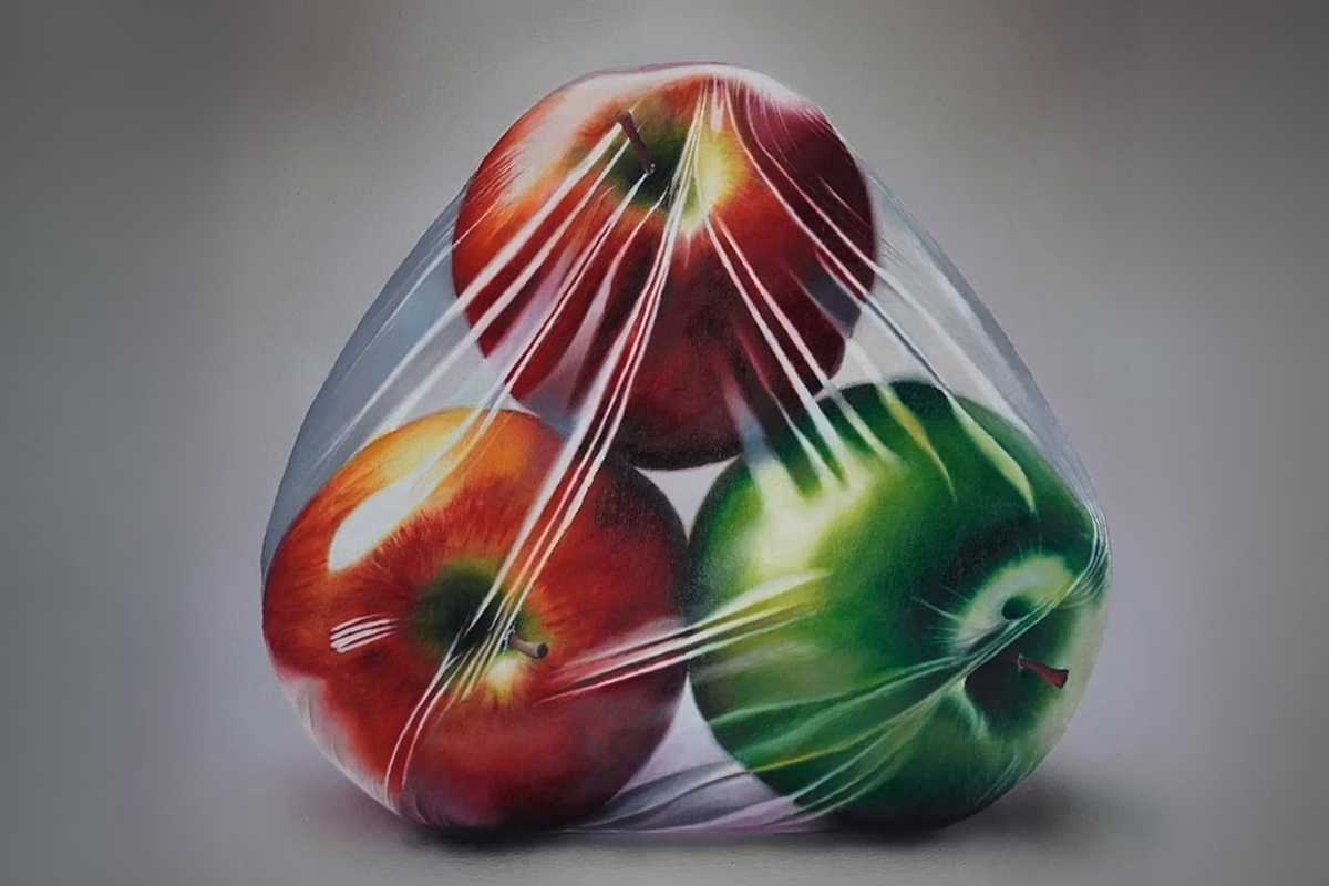 This project focuses on apples covered in plastic wrap—an unexpected motif that’s perfect for exploring reflections, translucency, and layered color.