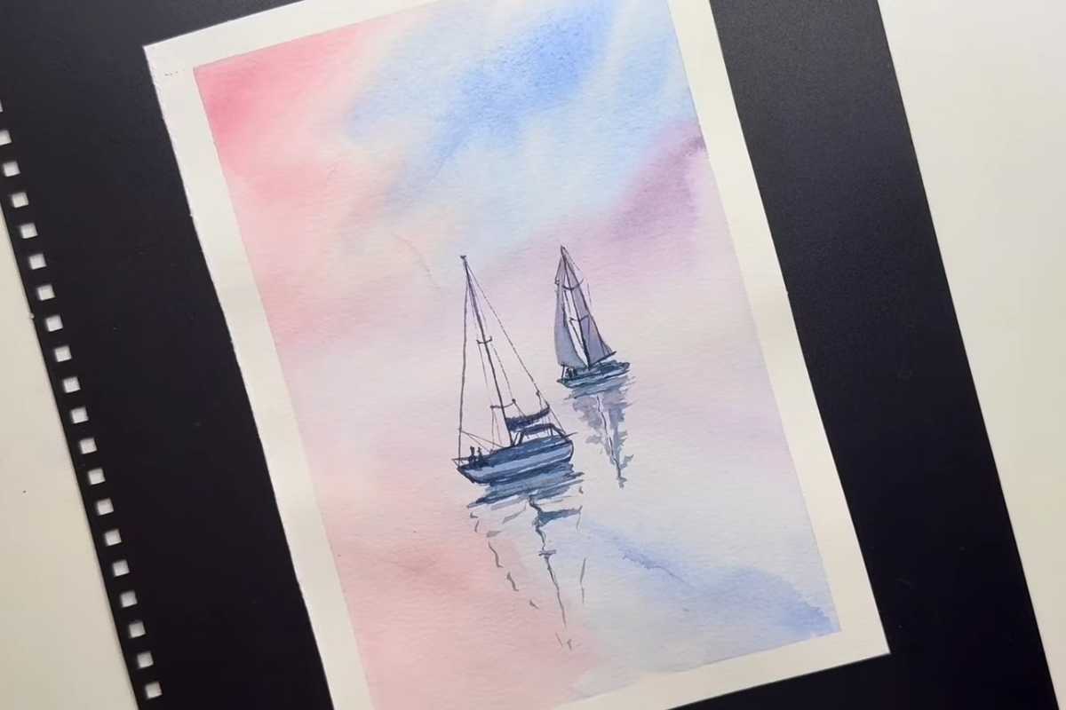 Keep your palette limited (two blues, a warm/cool yellow, one red) to avoid mud. Work large to small: sky, land, accents, then details. It’s a great entry for those compiling simple watercolor paintings ideas easy to customize later.