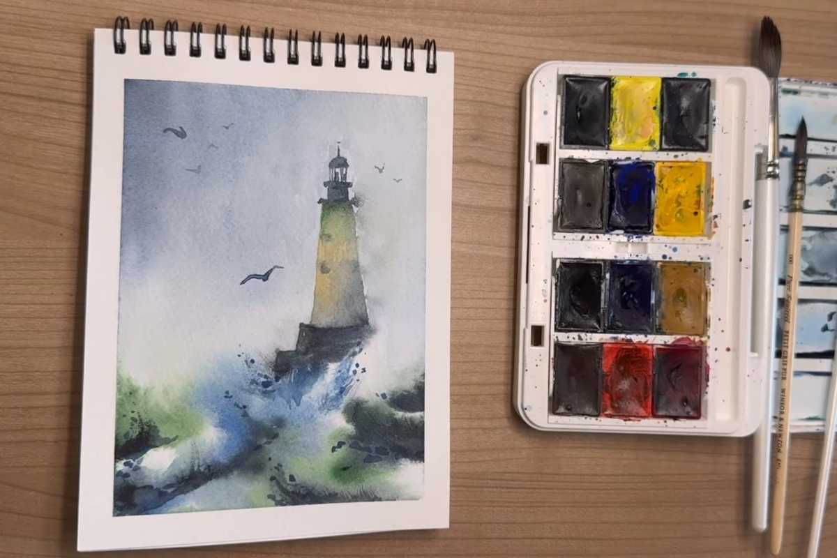 Try a graded wash from warm near the horizon to cooler aloft; then glaze shadows on the lighthouse for volume. If you love coastal themes and want watercolor art paintings easy but striking, start here.