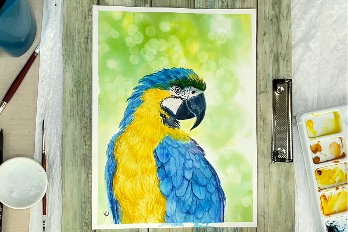 Flip your process: paint the background first to establish mood and silhouette, then drop in the parrot’s saturated colors.