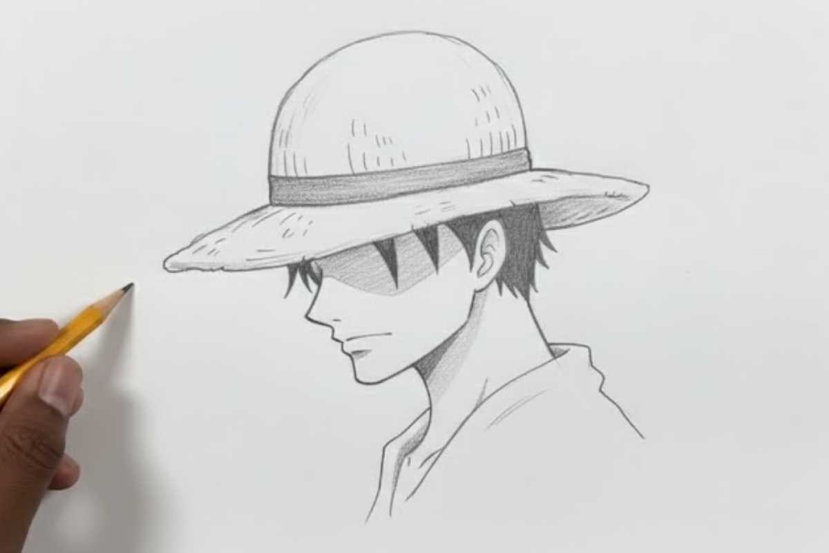 Begin with a sphere for the skull and a wedge for the jaw. Place the hat brim as a broad ellipse and keep the facial features simple and expressive. This approachable demo is ideal for clean, readable aesthetic anime drawing studies.