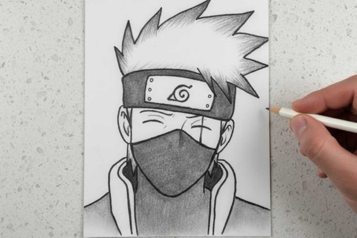 Mask, headband, and asymmetrical hair spikes do the heavy lifting. Focus on clear overlaps (mask over face, hair over band) for a polished read. Add subtle line-weight variation to elevate your anime drawing sketches without overworking details.