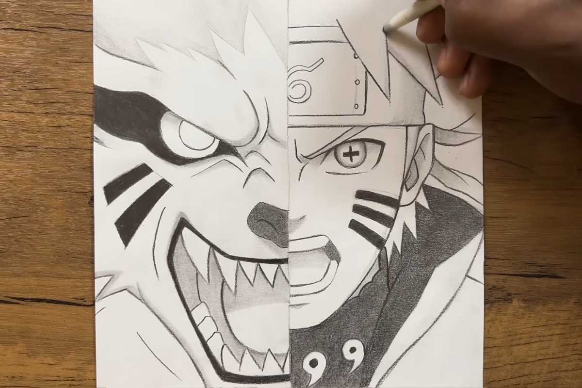 Block Naruto’s features first, then suggest Kurama behind him with bold, simplified shapes.