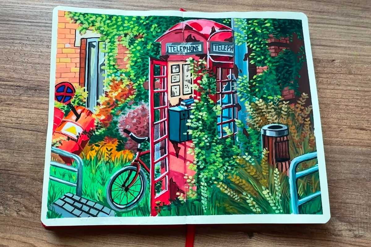 An everyday object becomes storytelling bait when staged with foliage and backlight. Learn to group values so the booth pops without oversaturation—a hallmark of Studio Ghibli Painting Ideas.