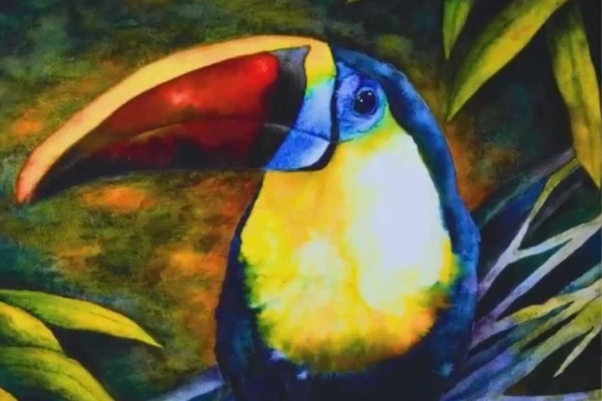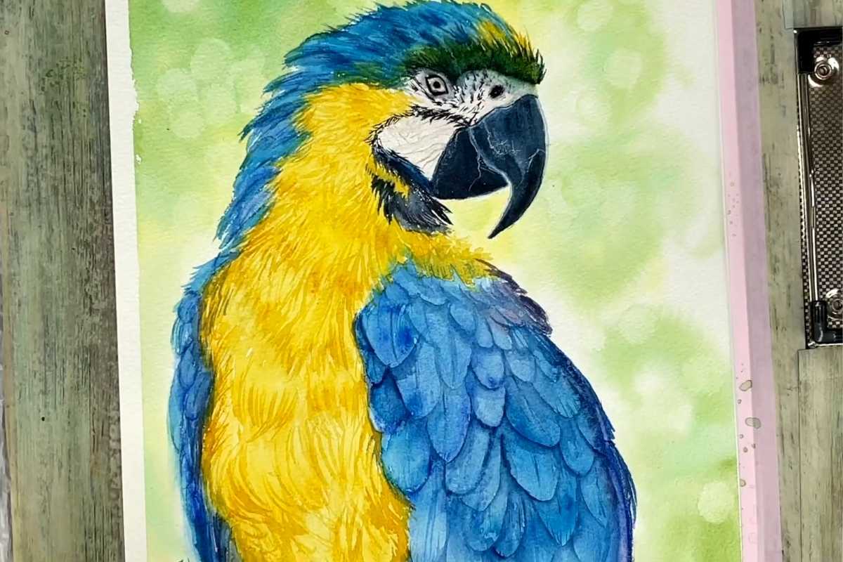 Parrots are perfect for saturated washes and crisp beak/eye details. You’ll explore wet-into-wet backgrounds that frame the subject and guide the viewer’s eye—an essential move in watercolor art birds.