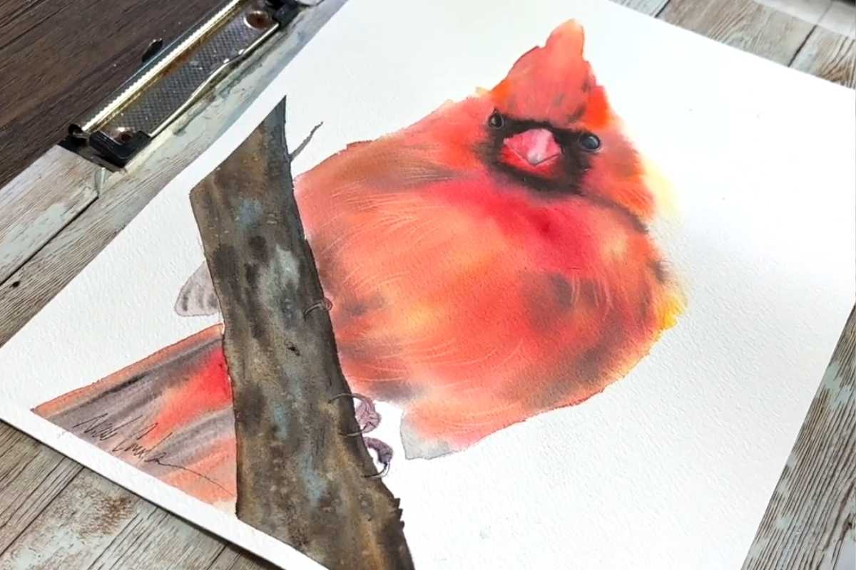 The red cardinal teaches value mapping: dark mask, bright body, and a few decisive shadows. Work in two passes—light local color, then selective accents—to keep it watercolor birds easy.