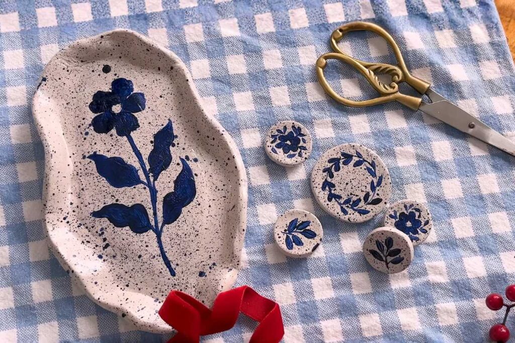 Perfectly imperfect texture: After drying, a light sand softens tool marks. A speckled base coat adds depth so simple blue florals pop—an easy way to elevate clay crafts air dry ideas without complex glazing.