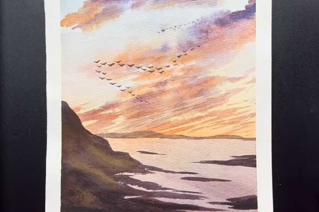 Add small accents only after the big shapes feel right. A hint of birds in the distance, a dark stroke for the shoreline, or a few textured marks on rocks can guide the eye.