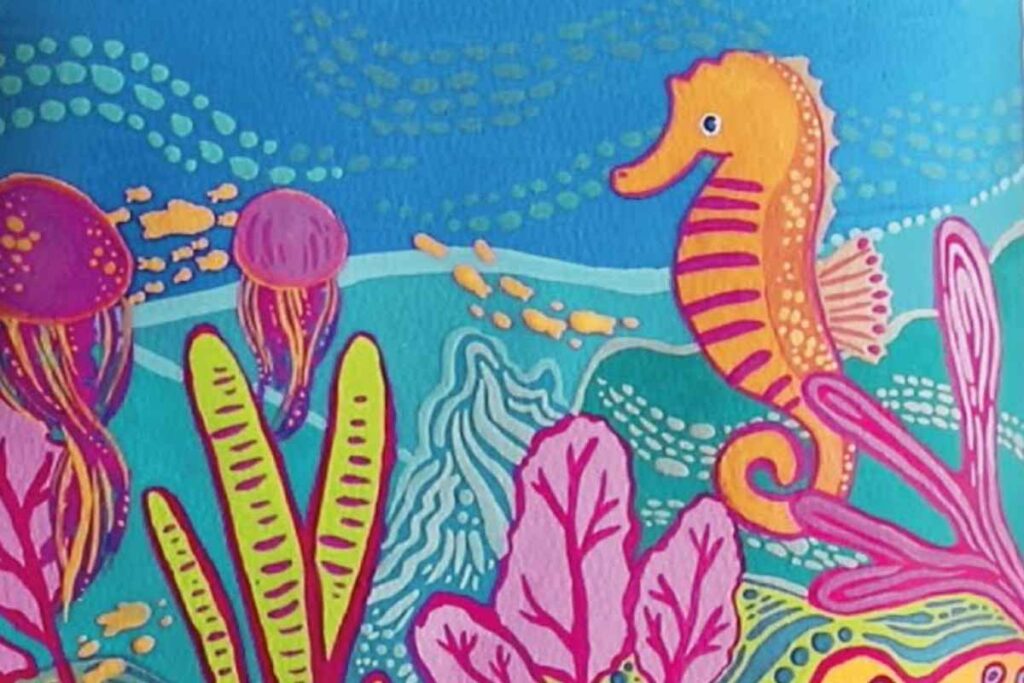 The instructor also explains how to create texture using small dabs and dotting techniques, which work especially well for coral and ocean-floor patterns. Combining fine line work with bold blocks of color helps keep the composition dynamic and visually interesting.