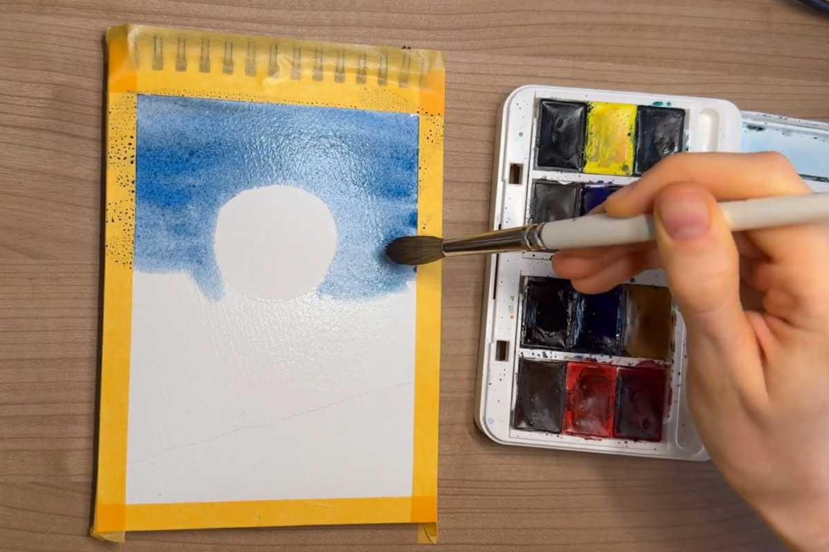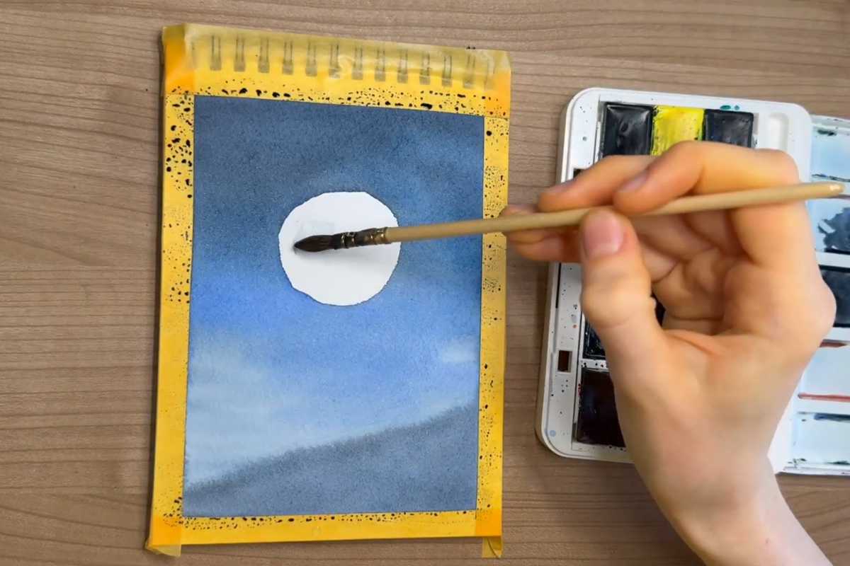 Once your sketch is in place, it’s time to start painting the background. Using a wet-on-wet technique, apply a light wash of color to the sky.