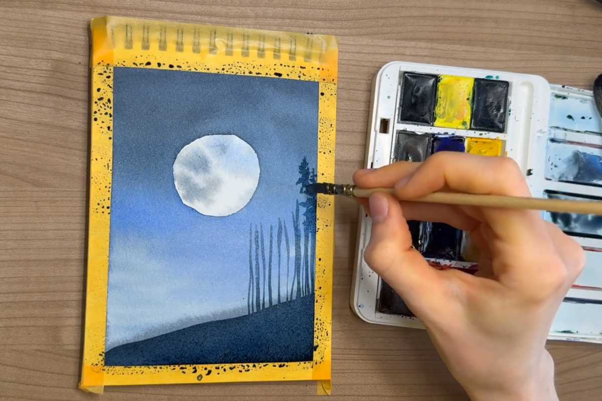 Apply a more concentrated pigment to create deeper shadows and highlights. For the trees, use a dabbing motion with your brush to create the textured appearance of leaves or branches.