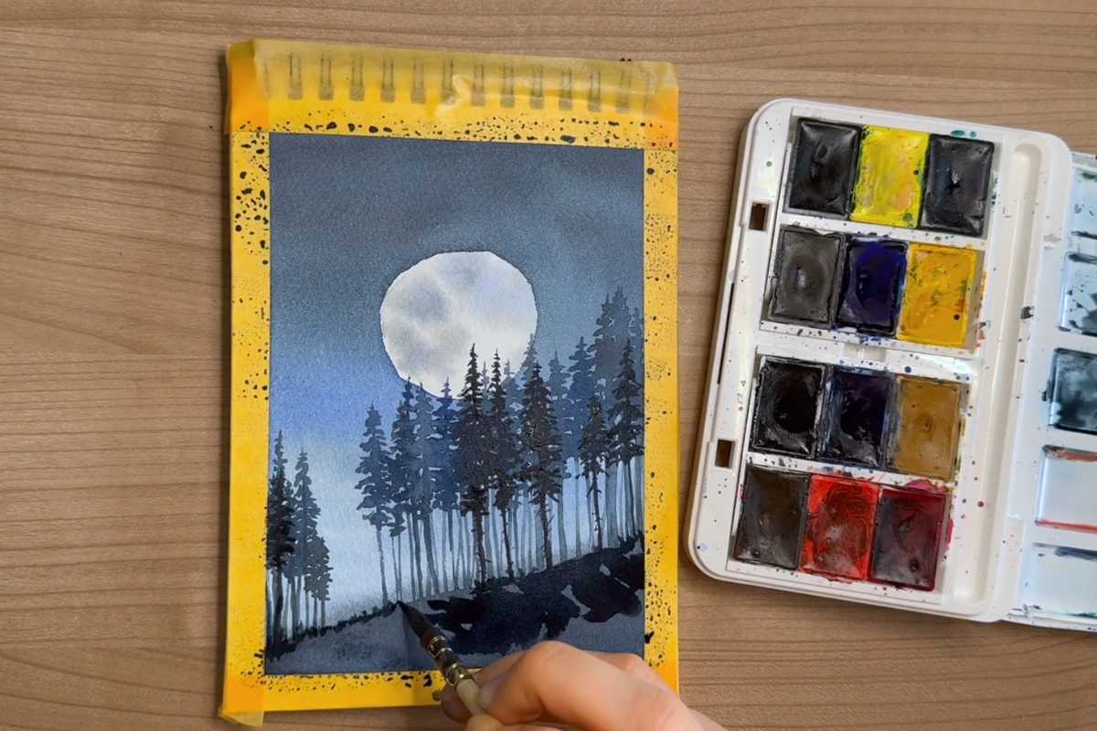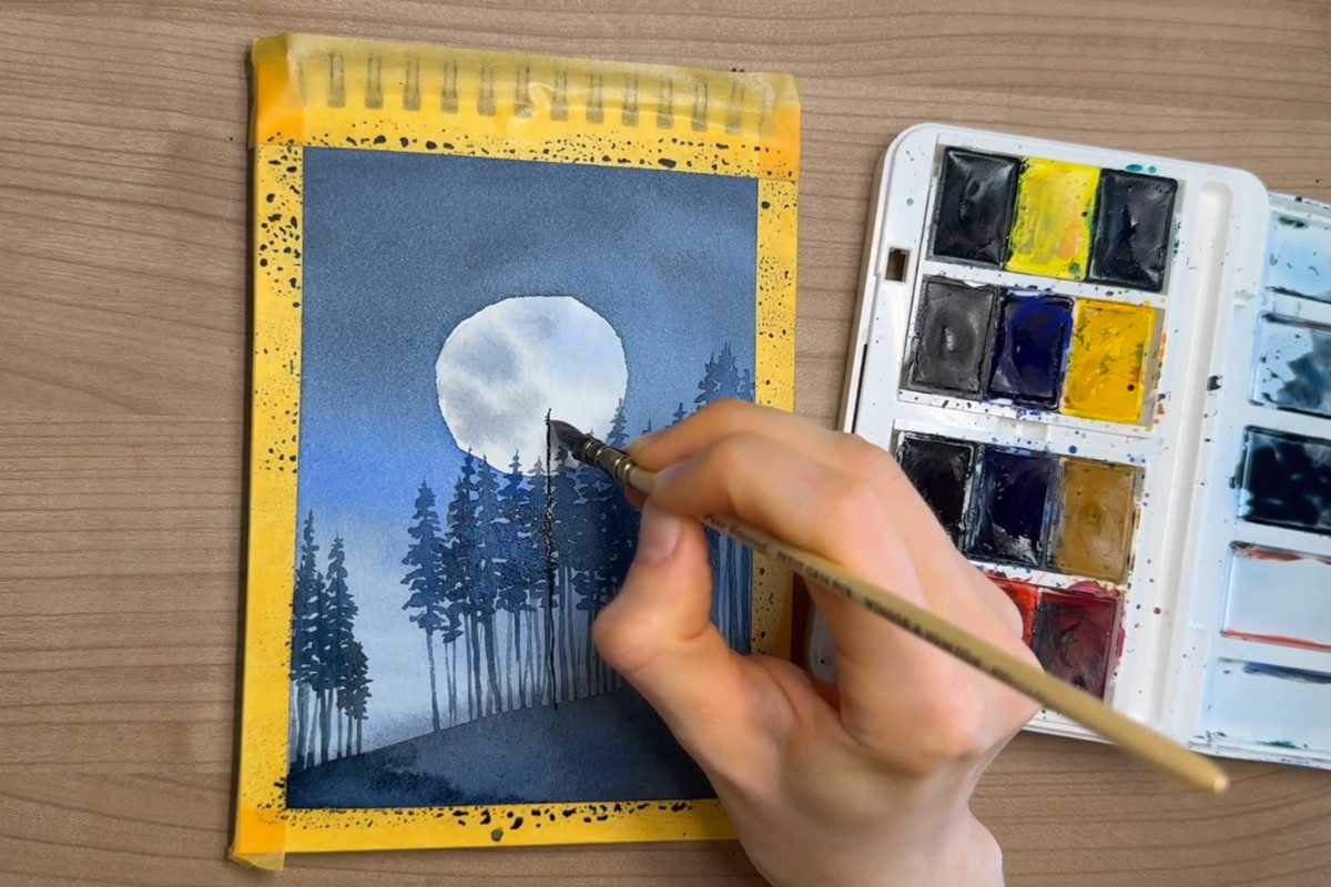 Next, focus on the trees, mountains, or any other elements that are in the foreground. This is where the wet-on-dry technique comes into play.