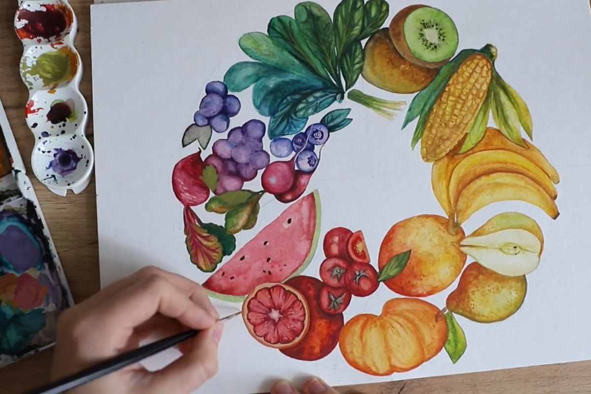 Watercolor painting allows for the creation of vivid, vibrant art, and one fun way to showcase the power of this medium is by painting fruits and vegetables in a rainbow circle.