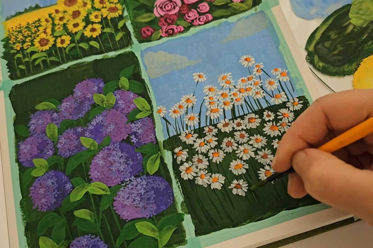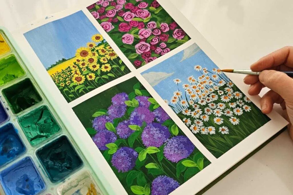 Ready for a clear gouache flower painting tutorial? This video walks beginners through four mini landscapes—sunflowers, roses, hydrangeas, and daisies—so you can practice color mixing, layering, and confident brushwork in bite-size sessions.