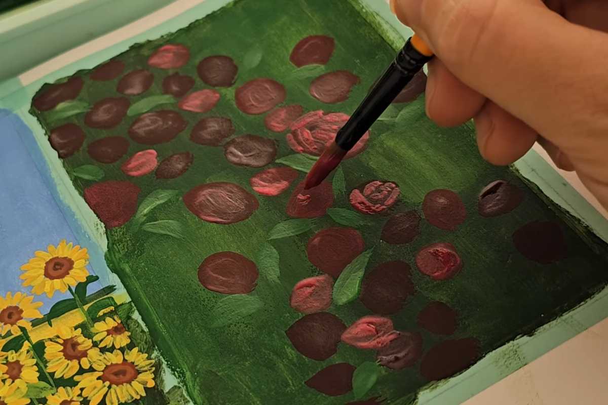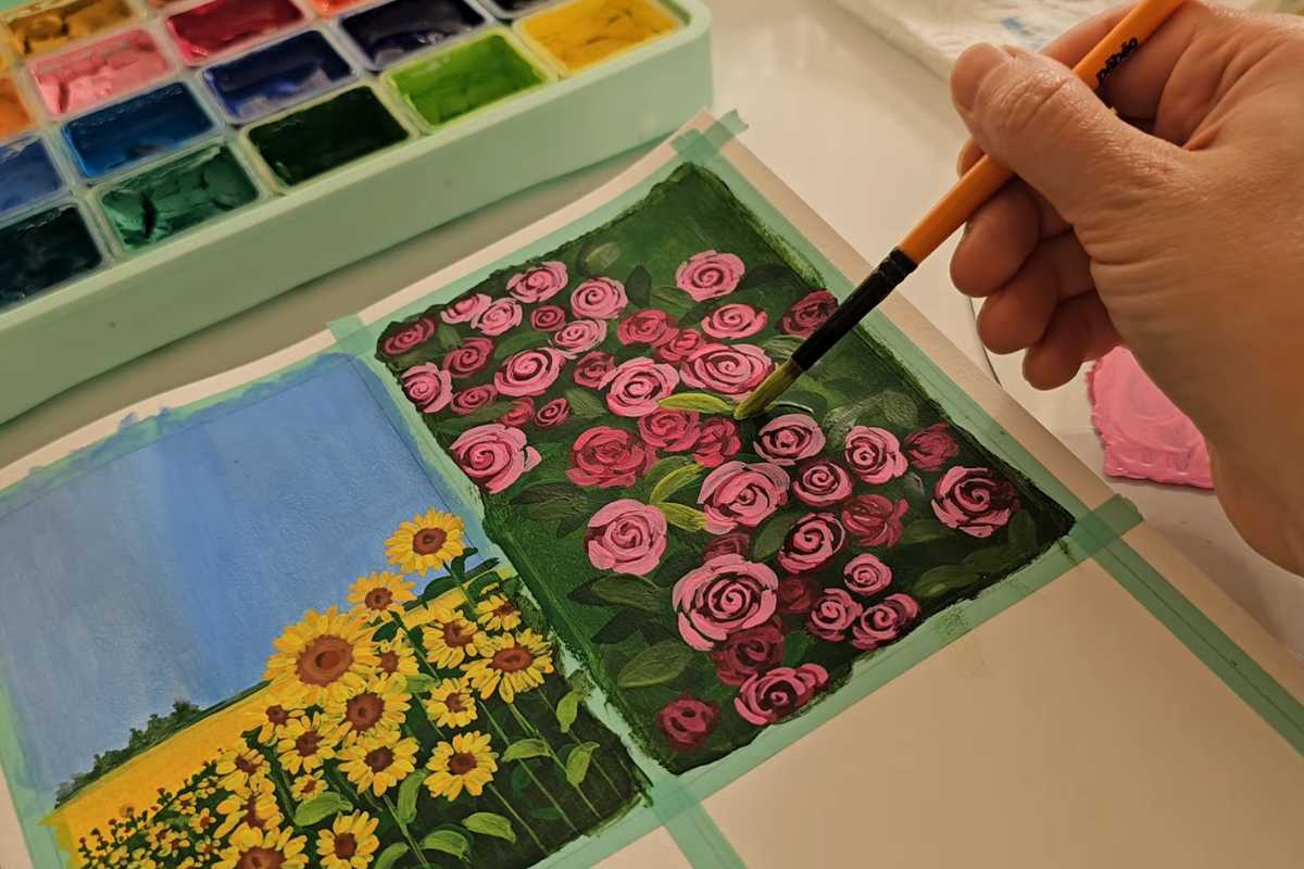 First, crisp skies and field gradients for sunflowers. Second, soft spiral strokes for roses that feel lively, not overworked.