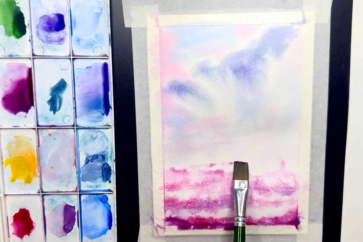 Whether you’re painting a sunset, an early morning sky, or a stormy day, make sure the colors flow naturally from top to bottom. The goal is to create an overall soft tone that sets the mood for the rest of the painting.