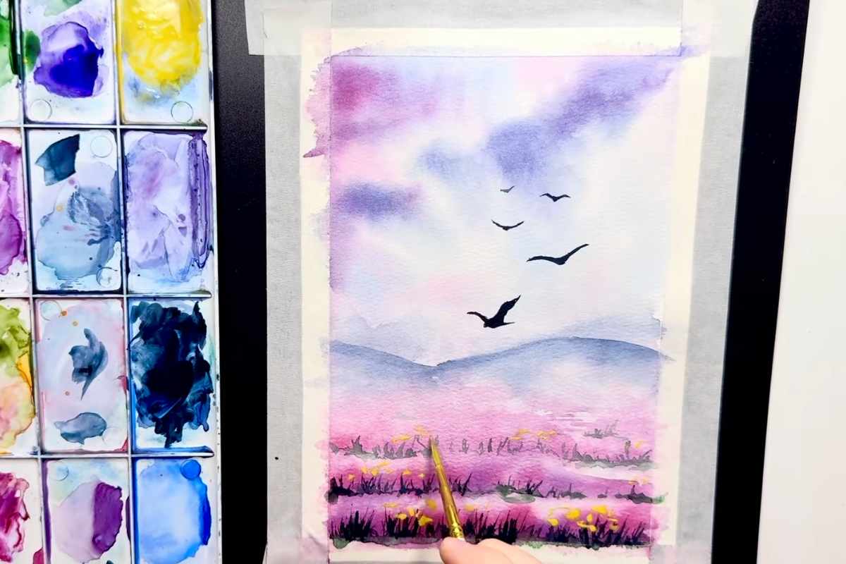 When adding trees, make sure to vary your brushstrokes to suggest texture in the bark and leaves. For birds flying across the sky, simply use a thin brush to add silhouettes against the backdrop. Remember to keep these details minimal so they don’t overpower the softness of the landscape.