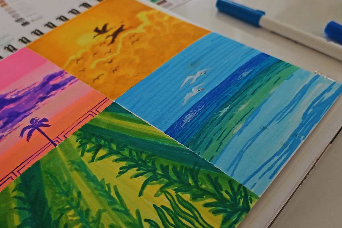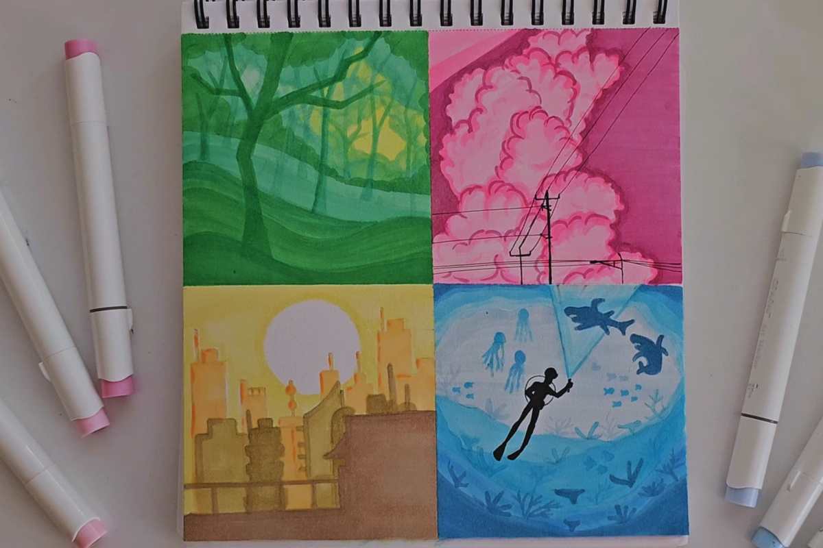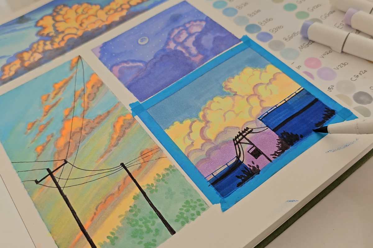 Need alcohol markers landscape art ideas? Start with three-value thumbnails: sky, land, accent.