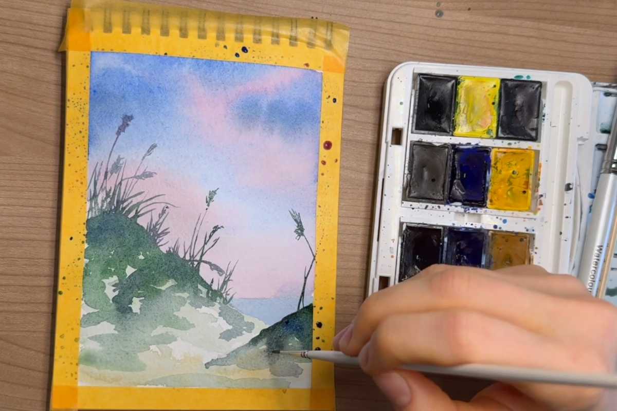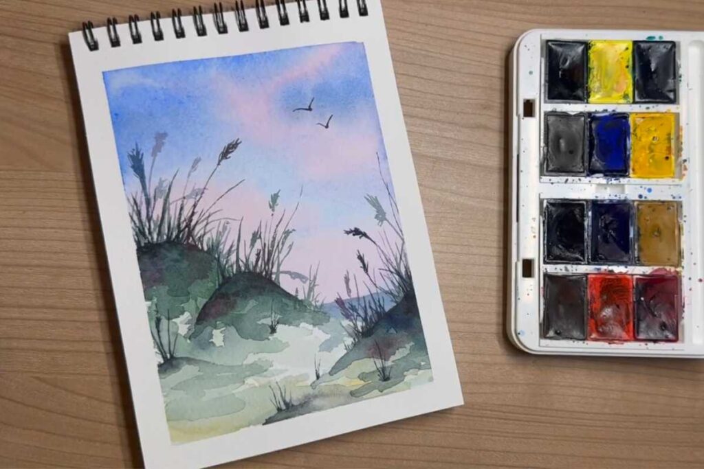 Ready to paint your first Landscape In Watercolor? This beginner-friendly video walks you through a calm coastal scene with layered hills, grasses, and a soft sky.