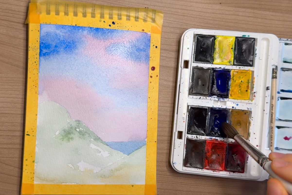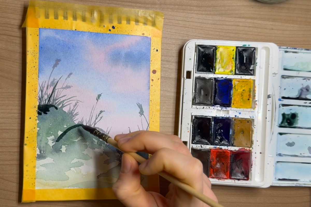 Start with the sky: wet the surface, drop in cool blues and a hint of warm pink, and let blooms settle naturally. This “wet-in-wet” stage creates a dreamy evening glow without harsh edges.