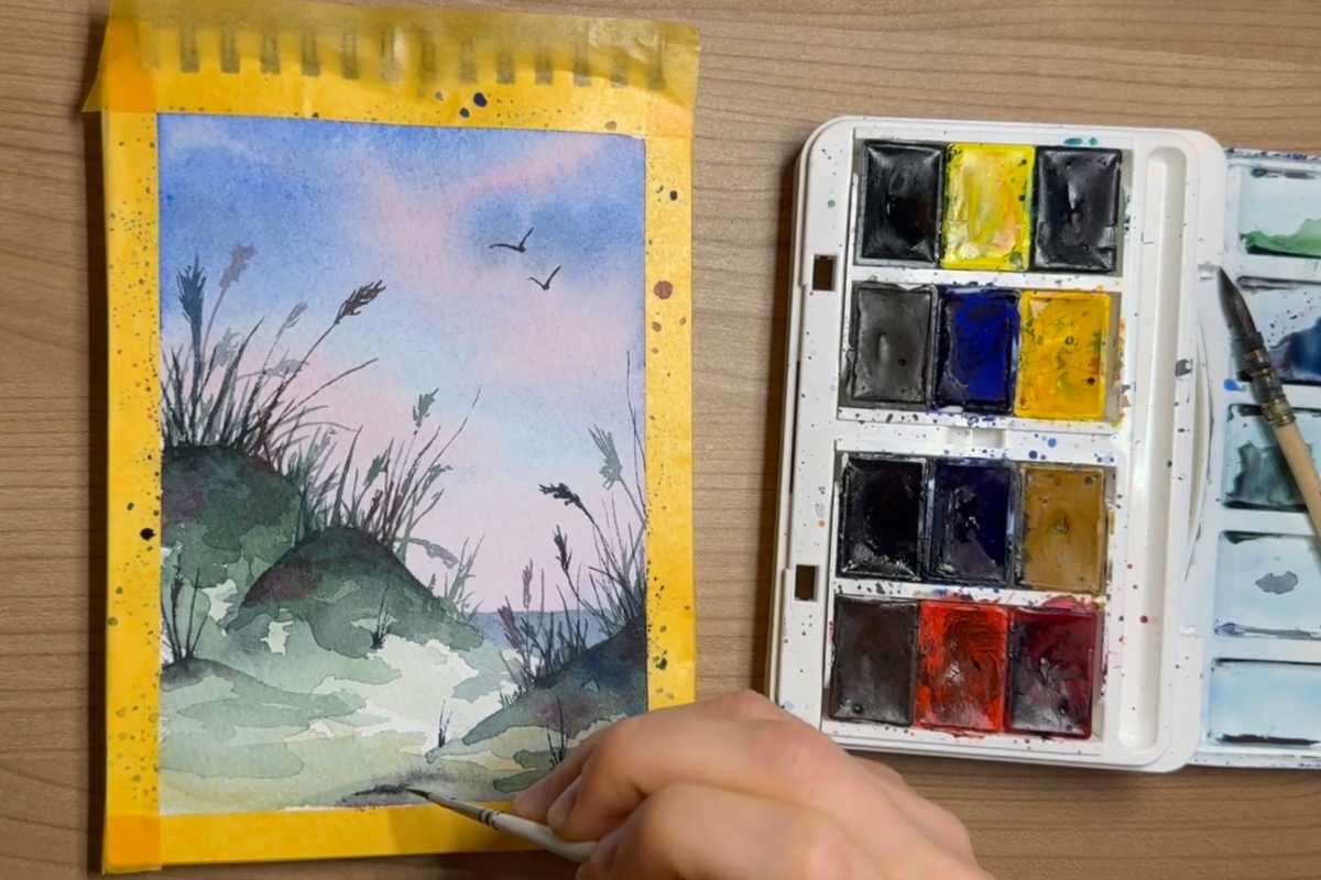 Dry fully, then add grasses and reeds with the liner brush. A few swift strokes suggest movement; less is more. Tiny bird silhouettes finish the composition for a breezy, coastal vibe.