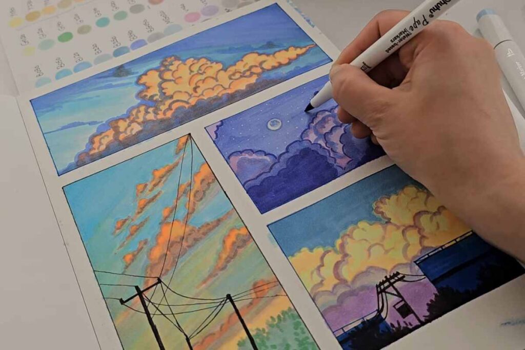 Drawing cloudscapes with alcohol markers is more than a technical exercise—it’s a creative way to connect with mood, color, and light. These four scenes will help you see the sky differently and express it with confidence and personality.