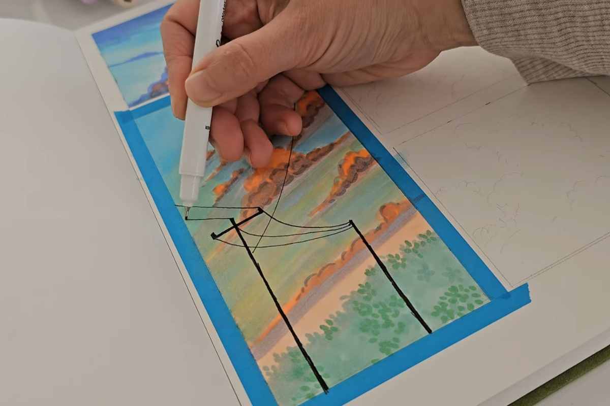 This second piece introduces man-made elements, like power lines and poles, framed by a pastel sunset. It adds narrative and composition to your cloud study, teaching you how to balance soft natural forms with hard lines.