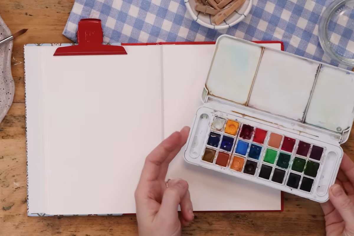 Use a sturdy sketchbook or journal, a small round brush, watercolor in a few muted hues, and colored pencils for details and headers.