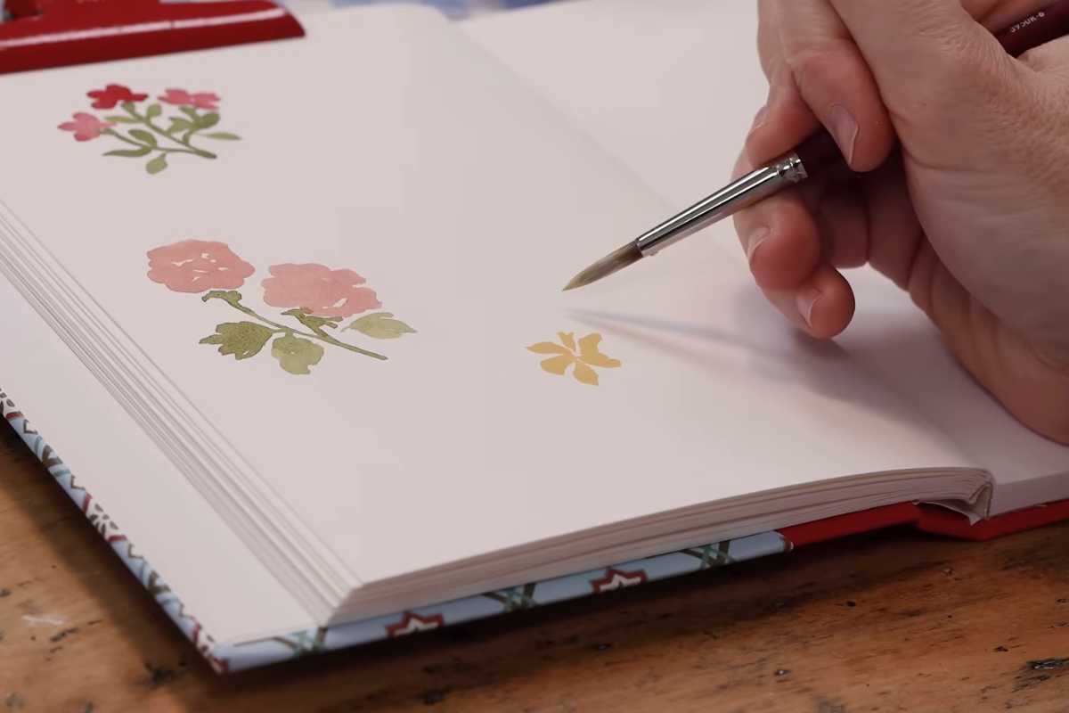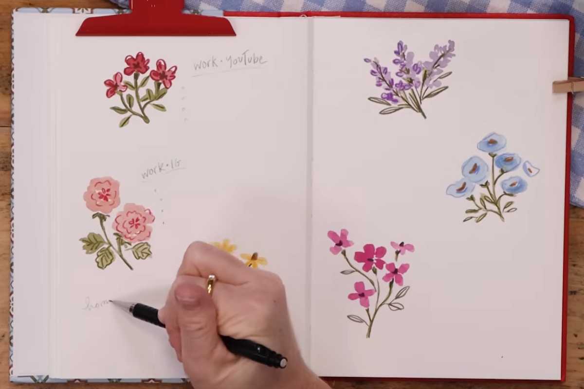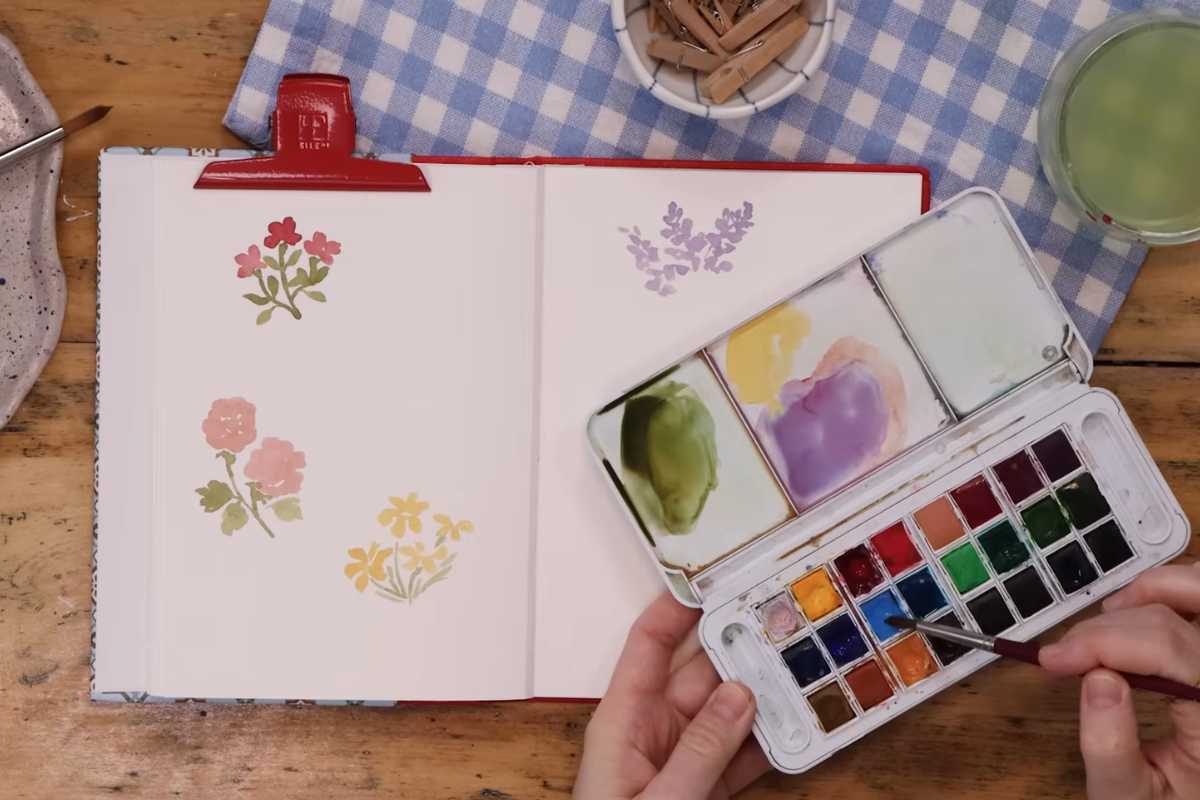 Paint soft blooms first, let them dry, then pencil in stems, labels, and tiny accents. The result is a tidy, cohesive look—a true art diary aesthetic.