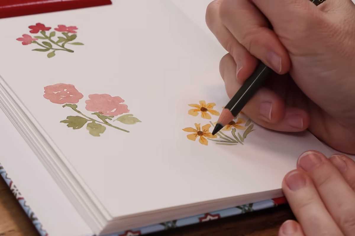 Keep the brushwork loose. Short, curved strokes suggest petals; a few pencil lines define centers and shadows. This balance of structure and spontaneity creates that “made by you” charm.