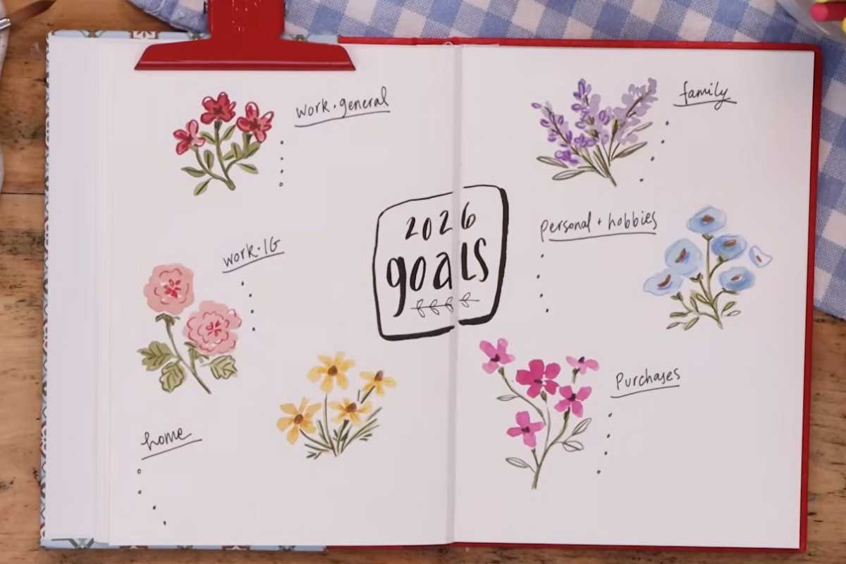 This mixed-media page blends loose watercolor and colored pencil to make “perfectly imperfect” flowers that label each category—work, family, wellness, finances, and more—so your goals for new year feel inviting, not intimidating.