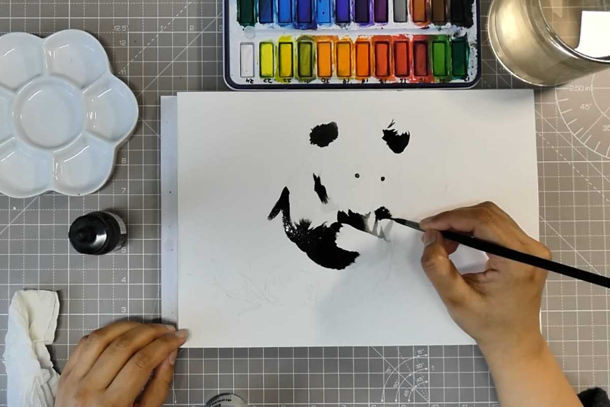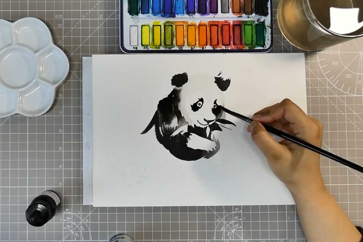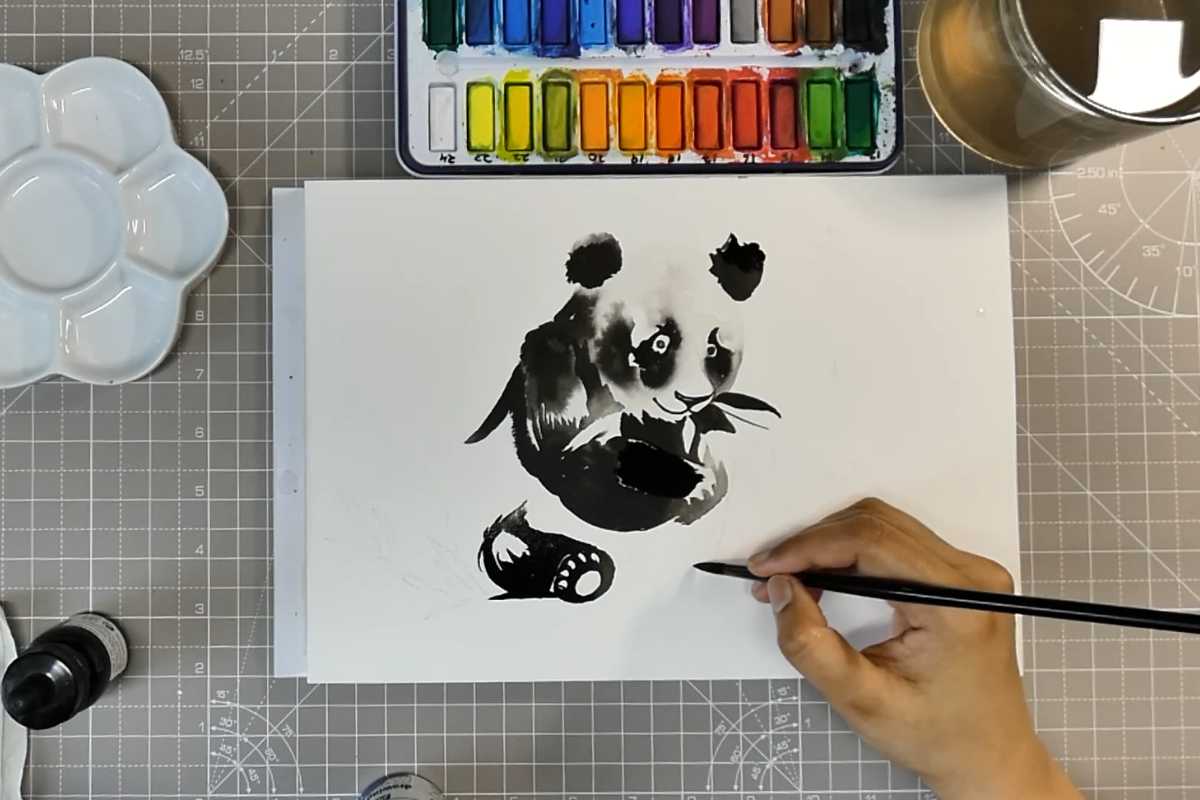 You’ll also see how drawing gum reserves key highlights, keeping the panda’s gaze bright in a moody black ink painting.