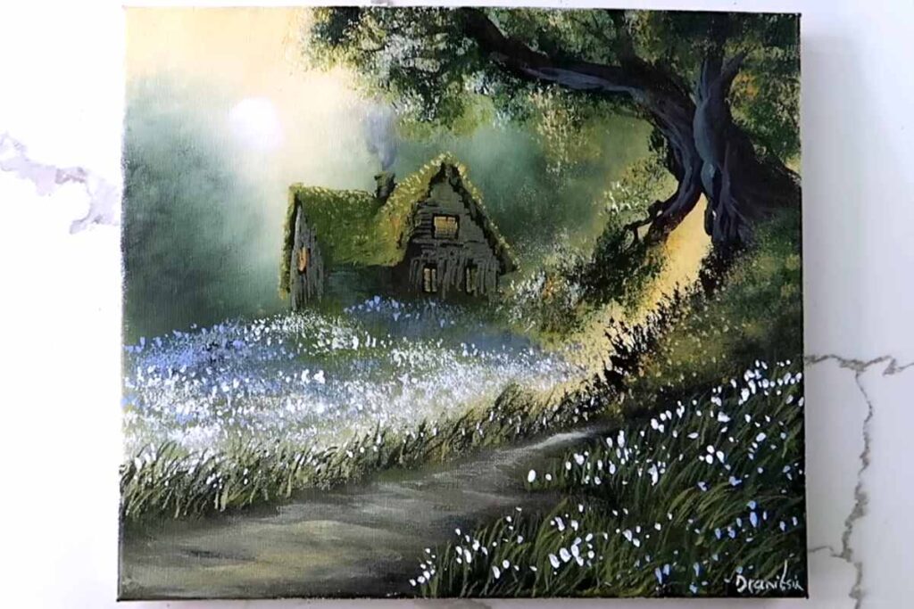 If you’ve ever dreamed of painting a serene landscape featuring a flower-lined path leading to a cozy cabin, then this tutorial is for you.