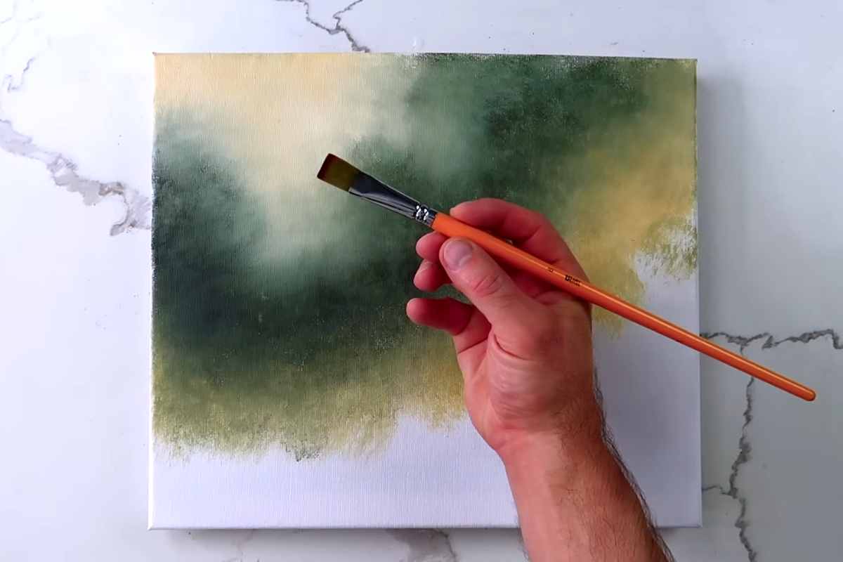 Use darker greens and blues for the shaded areas and lighter shades for spots where the sun hits. The tree branches should have a flowing, organic feel, giving the painting a sense of movement as they reach across the canvas.