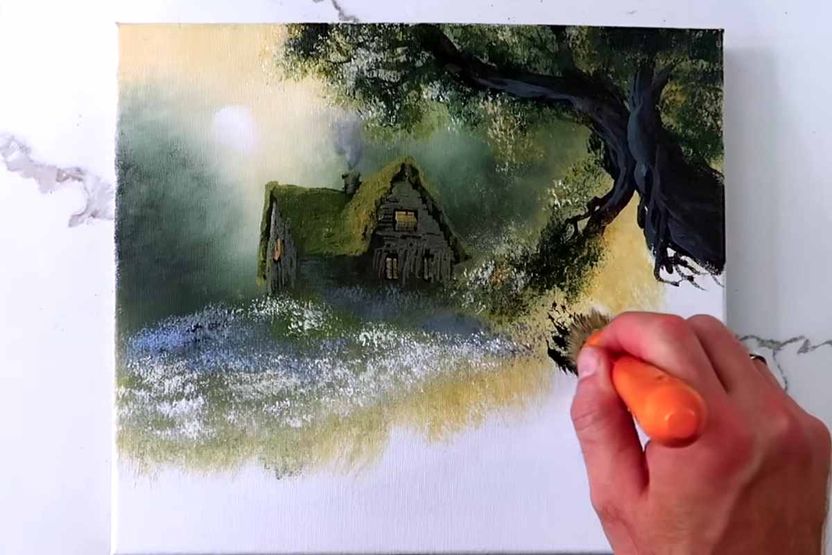 Consider using a glazing technique with acrylics to build up transparency in specific parts of the painting. For example, a light glaze of yellow or white on the top of the flowers or over the cabin’s windows can suggest sunlight gently caressing the scene.