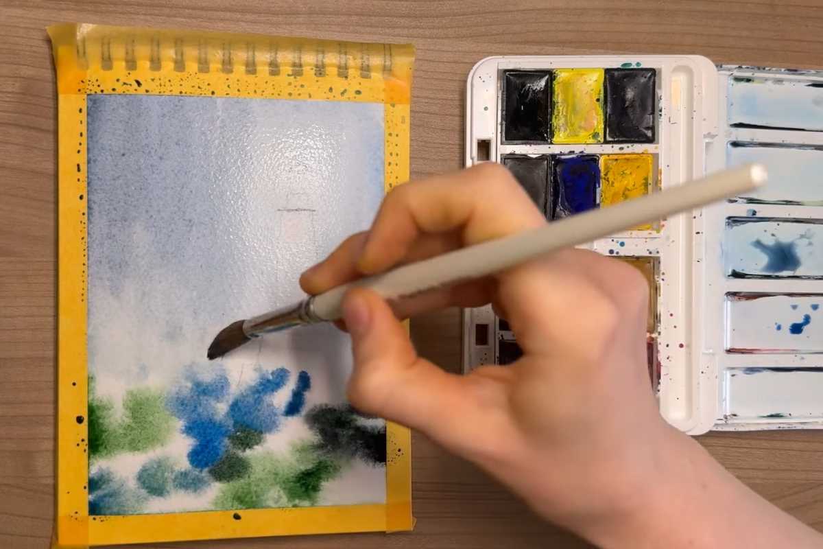 Start with the sky wash, dropping color into damp paper to suggest clouds and distance. Fade toward the horizon for air perspective. While it’s still moist, touch in hints of sea tones so the transition feels natural.