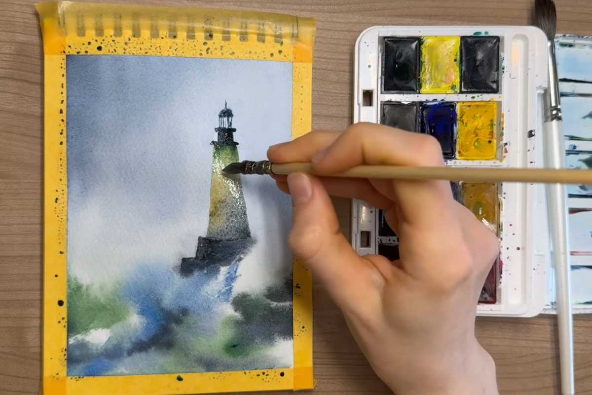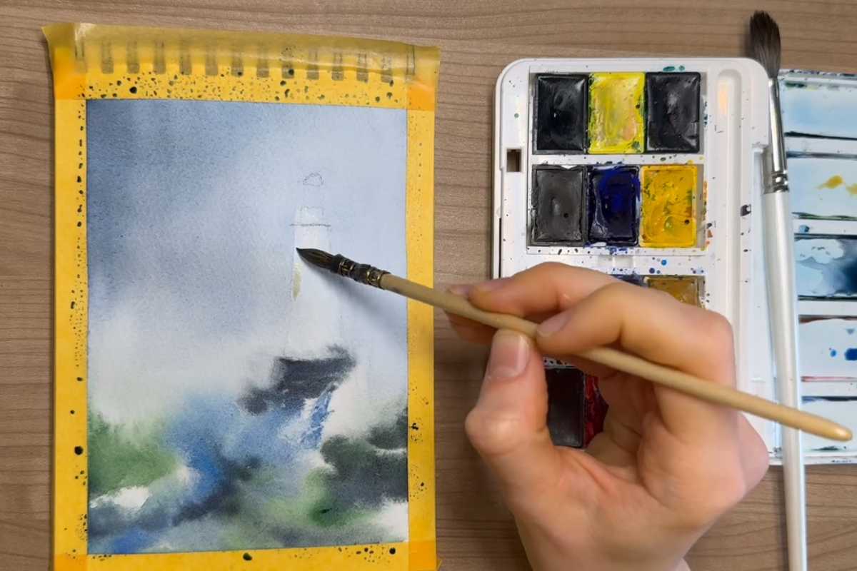 Vary edges—soft in the mist, sharp on the lighthouse—so the structure pops from the fog. If a wash blooms unexpectedly, integrate it as atmosphere rather than fighting it.