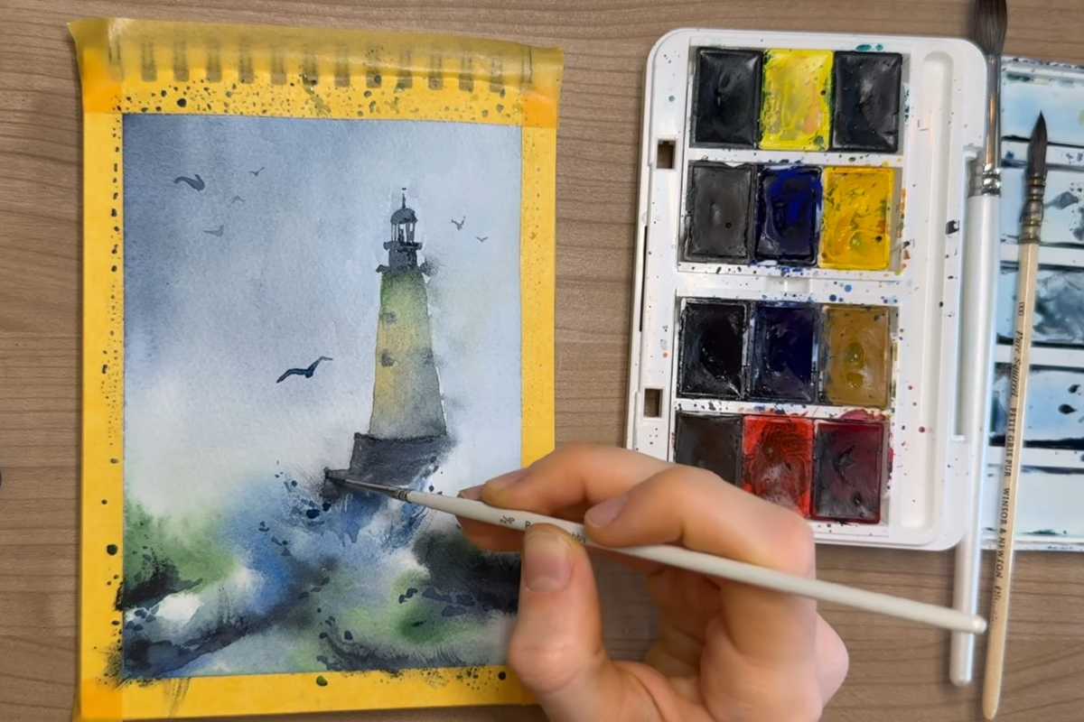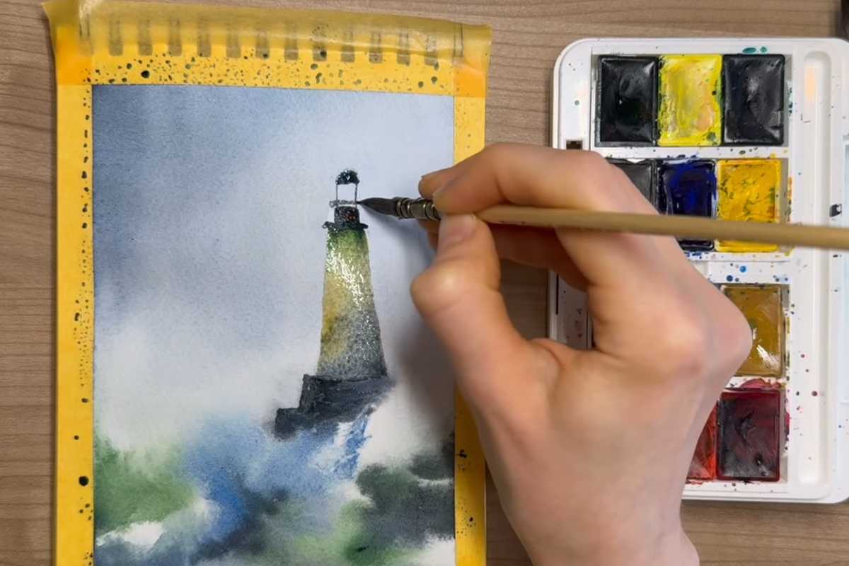 Once the base is dry, establish the lighthouse with firm shapes and crisp edges. Reserve a slim highlight along one side to imply sunlight; deepen the opposite edge to add form. A few birds and splashes finish the story without clutter.