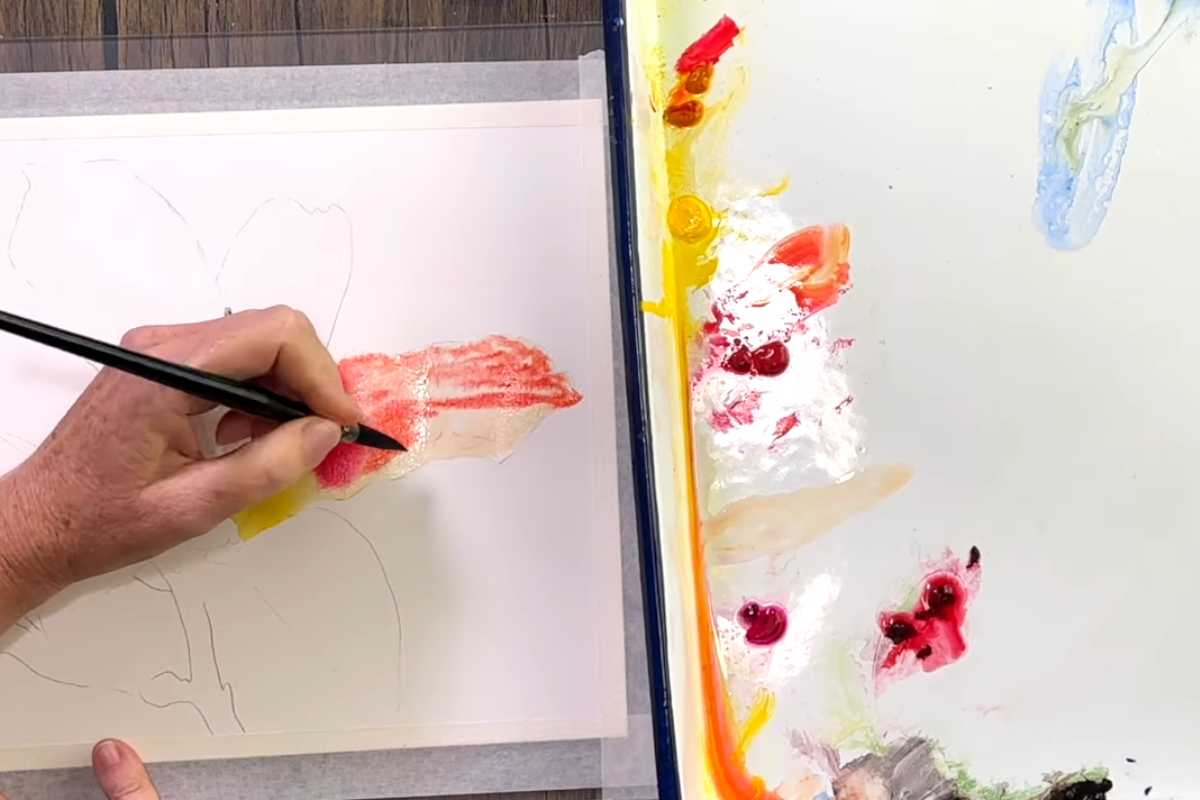 Before you begin, test mixes on a scrap to find your “glow” color. A tiny touch of pink in the yellow creates the peach tones that define classic lilies watercolor painting.