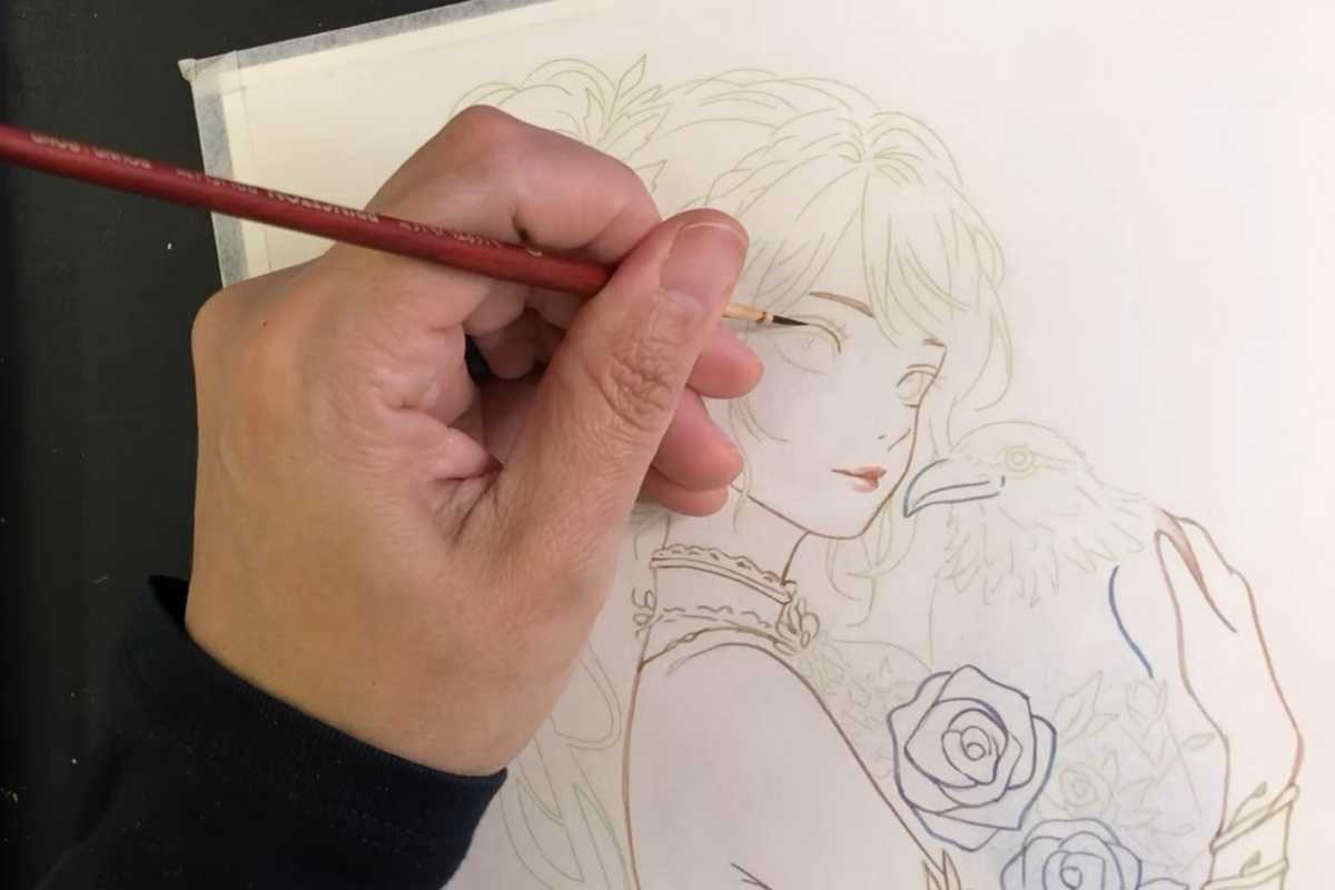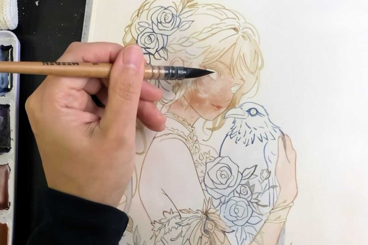 The artist begins with a confident pencil layout that locks in gesture, value, and focus. From there, light washes establish mood while reserving highlights on the face, dress, and raven.