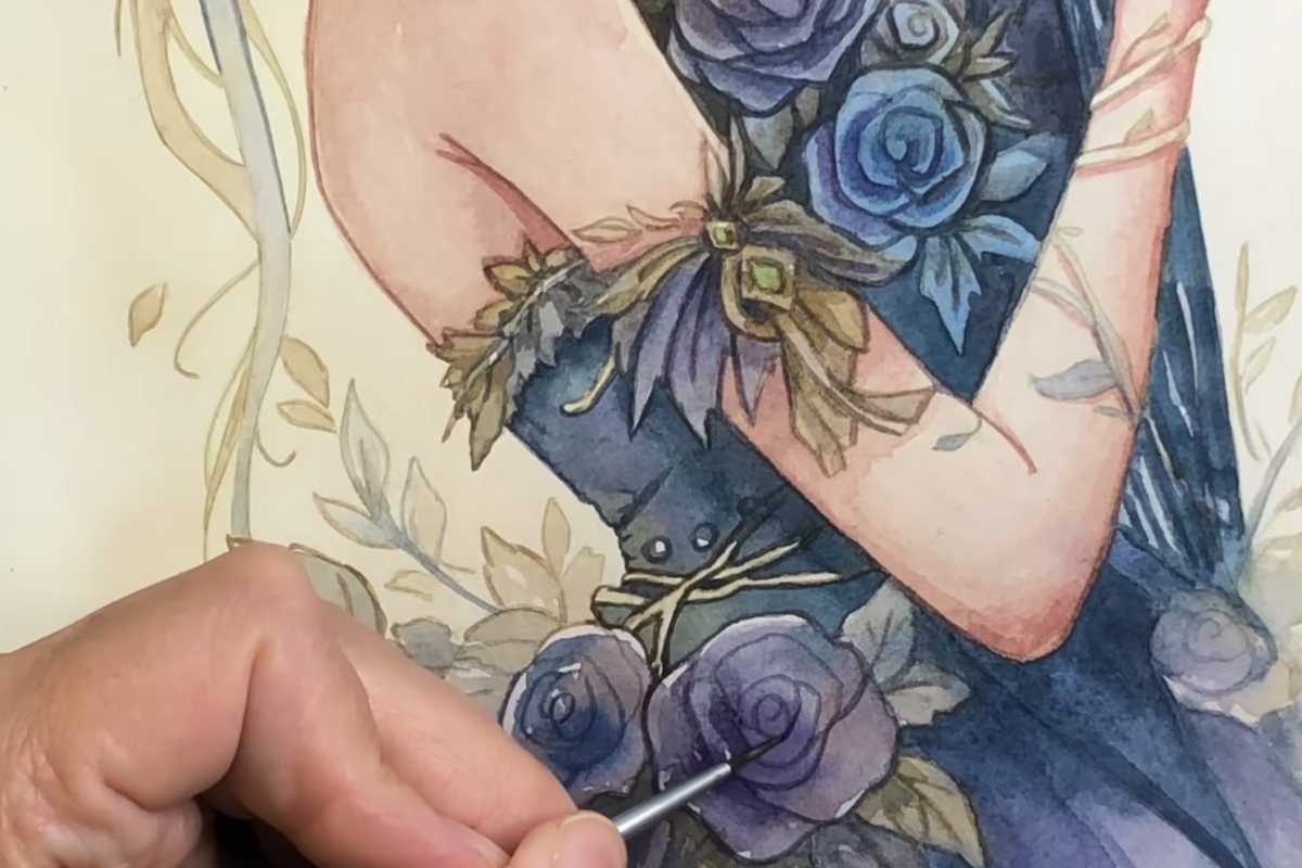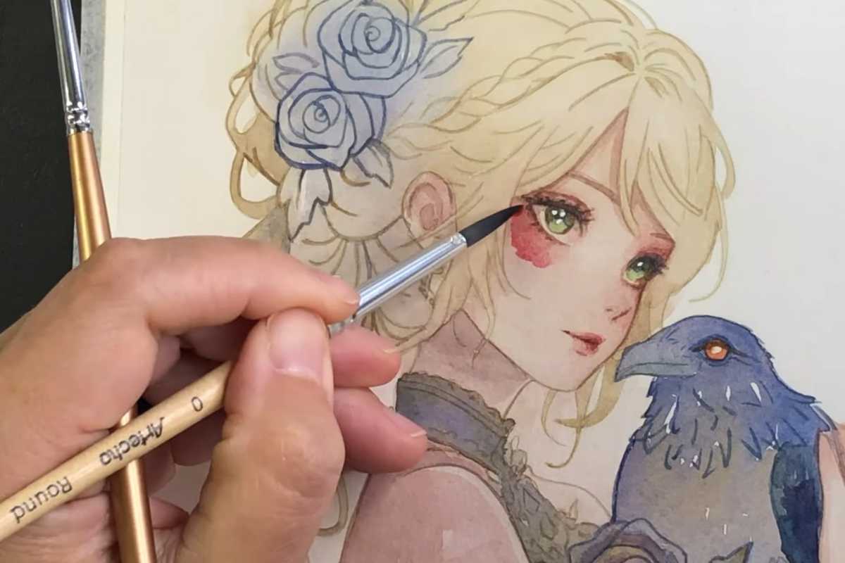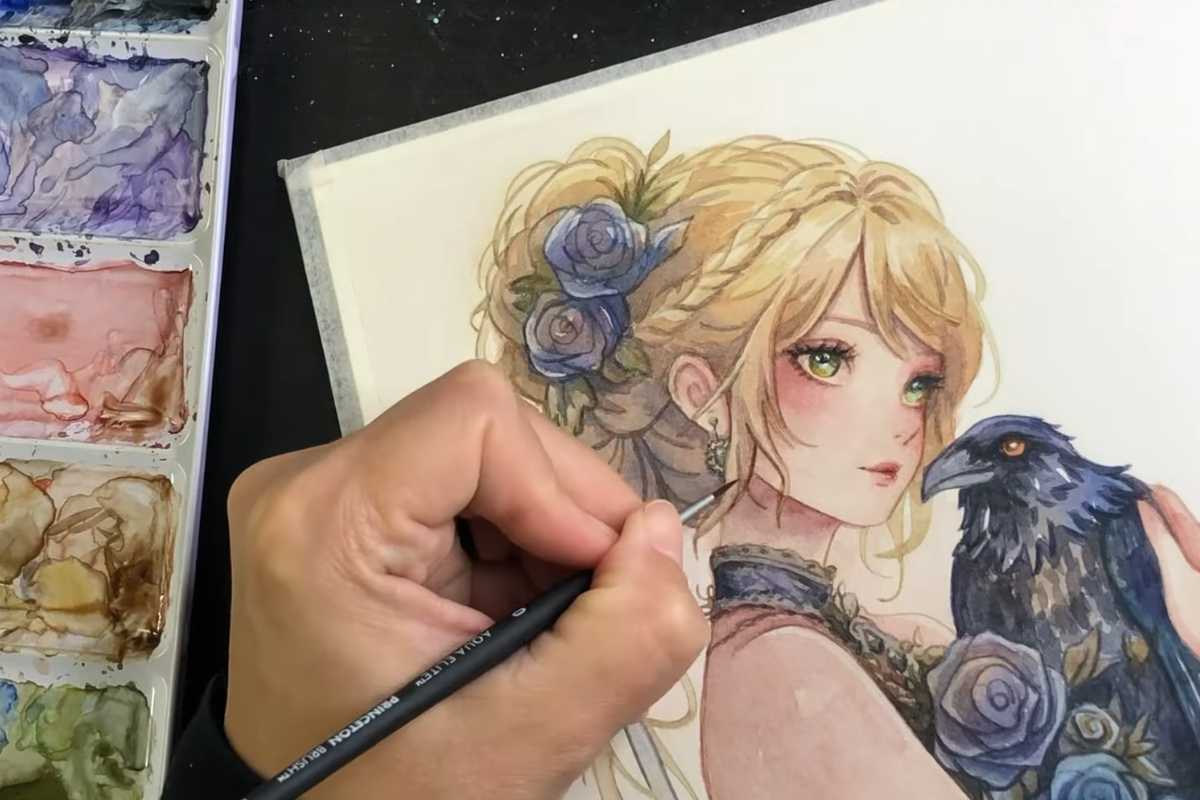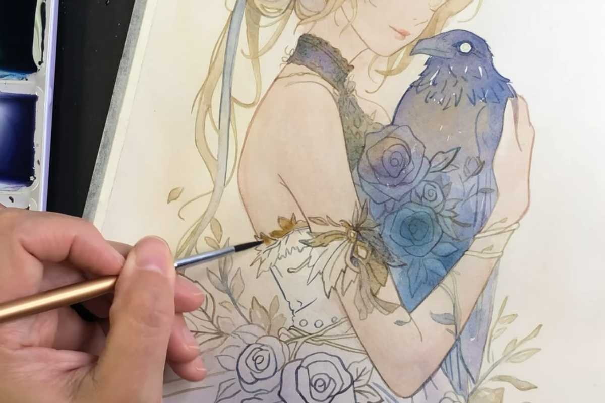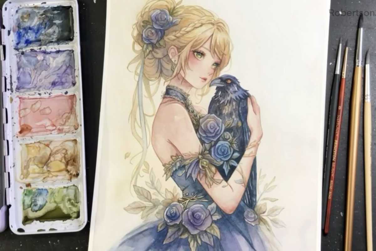 This curated guide explores a watercolor painting illustration called “The Crow’s Maiden,” a poetic portrait that blends fantasy styling with refined glazing.